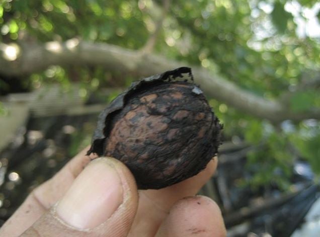 Sono riconoscibili sui frutti immaturi le punture della mosca. La polpa e la buccia del mallo iniziano a marcire in concomitanza con l’attività trofica delle larve di Rhagoletis e si colora di nero. La consistenza della polpa diminuisce ed infine secca. Occasionalmente, nei frutti infestati ospitano anche larve di mosca di altre specie. Questi decompositori secondari vengono attirati dai malli in decomposizione.