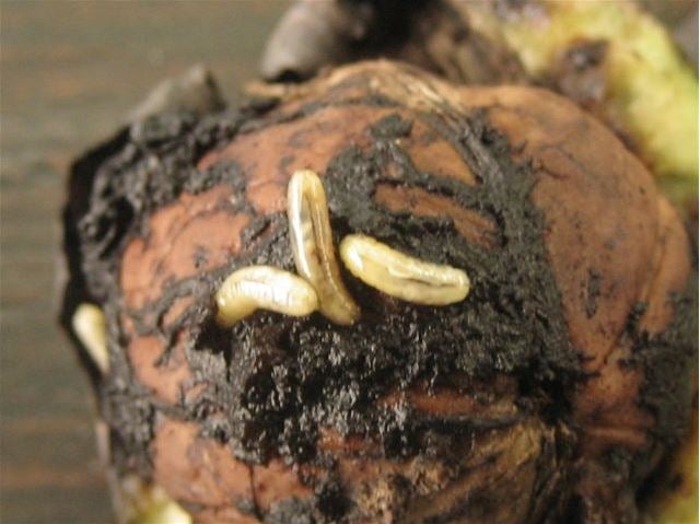 Le larve, che si sviluppano sono di colore giallo biancastro e si nutrono del mallo, il quale diventa molle e vischioso ed infine diventa nero. Un singolo mallo può essere attaccato da più di 25 larve.